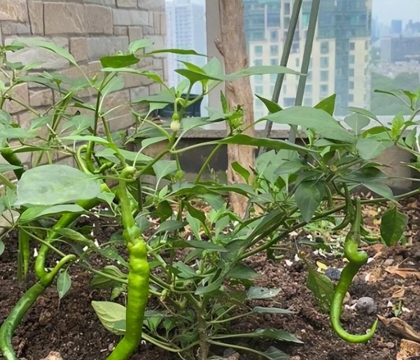 辣椒的长势不错,长长、弯弯的辣椒是常见的品种。