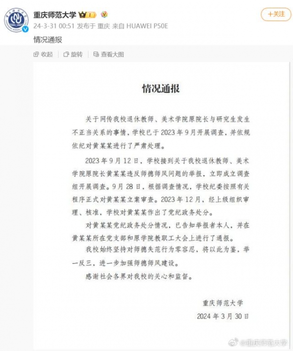 3月31日凌晨,@重庆师范大学 发布情况通报: