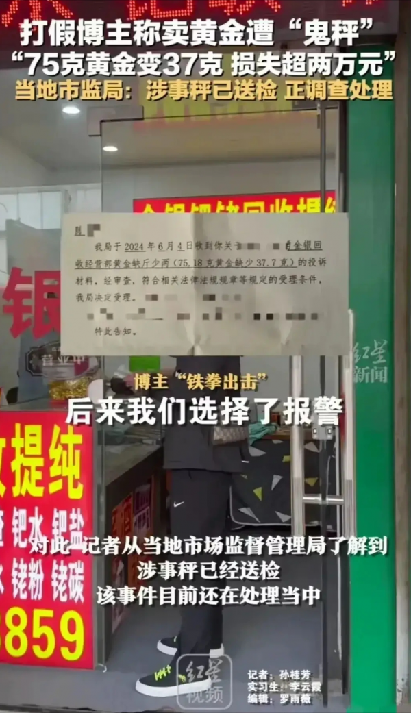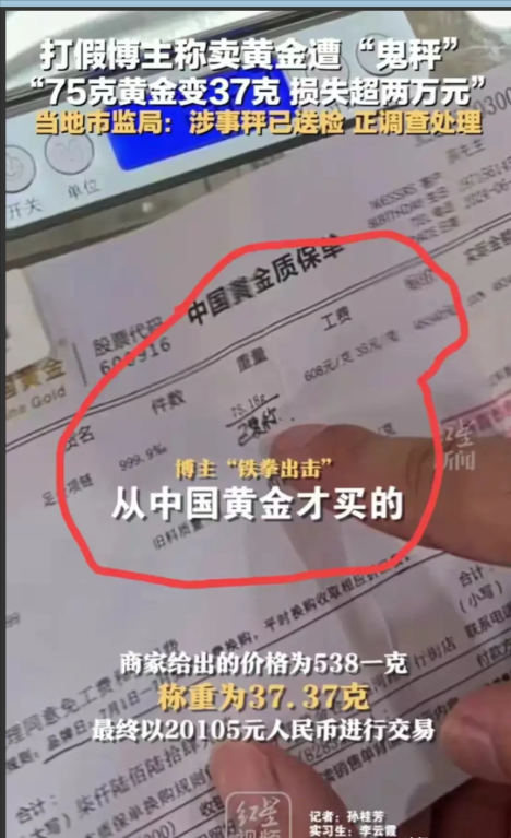 故事的起因是一件看似平凡的事件--购买黄金。然而当博主手中的75克黄金一进店就神奇地缩水到37克时,事情的走向就彻底改变了。明显是老式"五两秤"被动了手脚,但店家却理直气壮地按每克538元的价格与博主"自愿"交易了2万多元。面对如此赤裸裸的诈骗行为,博主当机立断报警求助。