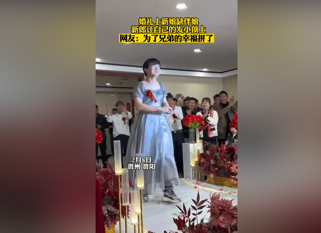 贵阳新人结婚,伴娘临时有事来不了,无奈之下,新郎只好让自己的发小男扮女装,换上伴娘服上台。网友直呼:还挺好看!