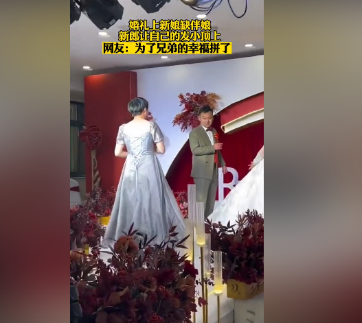 这位"伴娘"毫不在意,双手捧着戒指大踏步而行,细心的网友还会发现:他脚上穿的还是运动鞋!