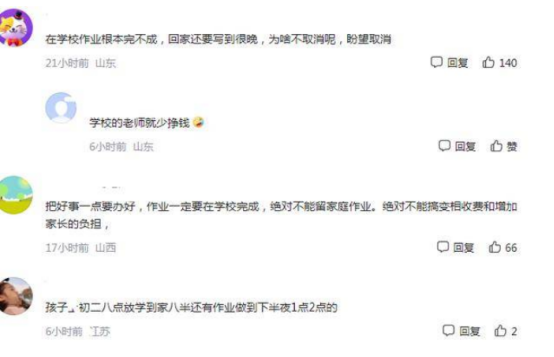 还有人表示:很多学校并没有辅导作业,而是复习知识,这样学生放学晚,回到家之后还要写作业到很晚,不利于学生学习的睡眠。