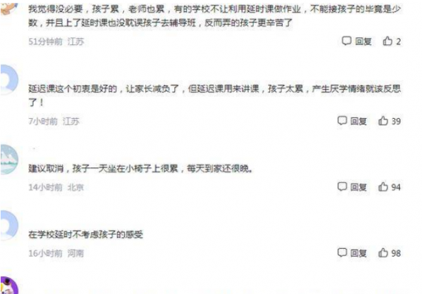 但是也有一部分家长并不喜欢这个政策,纷纷建议取消,有家长说:延迟两个小时放学,那么学生就要延时吃饭,这样也不利于青春期的孩子长身体。
