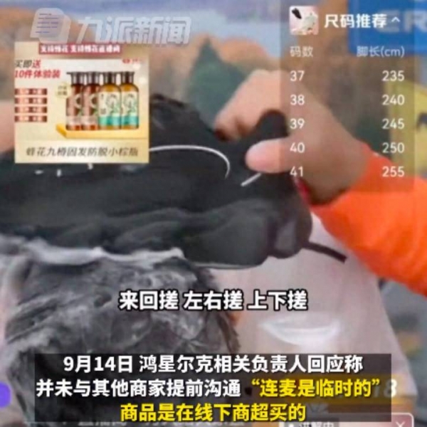 9月13日,鸿星尔克在直播间卖蜂花的上海硫磺皂,产品展示台还摆放了蜂花产品,主播甚至开始用蜂花洗发露直播洗头。