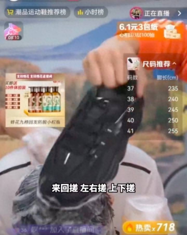 其中一主播拿鞋涂上蜂花洗头,并称"鞋底是防滑耐磨的,按摩鞋底你看就这样啊,来回搓,左右搓,上下搓。"