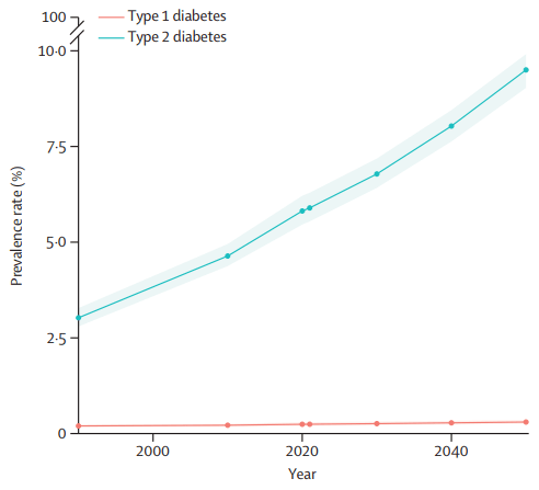 在该研究中,研究人员通过2021年全球疾病负担(GBD)研究,分析了1990-2021年间204个国家和地区按年龄和性别划分的糖尿病患病率、发病率和死亡率,预测了到2050年的糖尿病患病率,并区分了1、2型糖尿病的估计值,量化了16个危险因素导致的2型糖尿病负担比例。