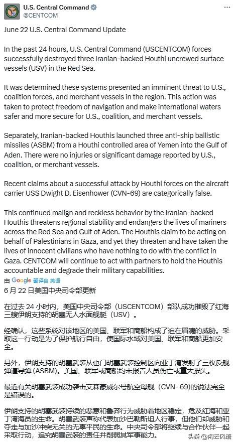 6月23日,美国中央司令部在最新的公告中再次否定了胡塞袭击艾森豪威尔号航空母舰的说法,并且还表示在过去的24小时内成功摧毁了红海三艘胡塞无人水面舰艇。