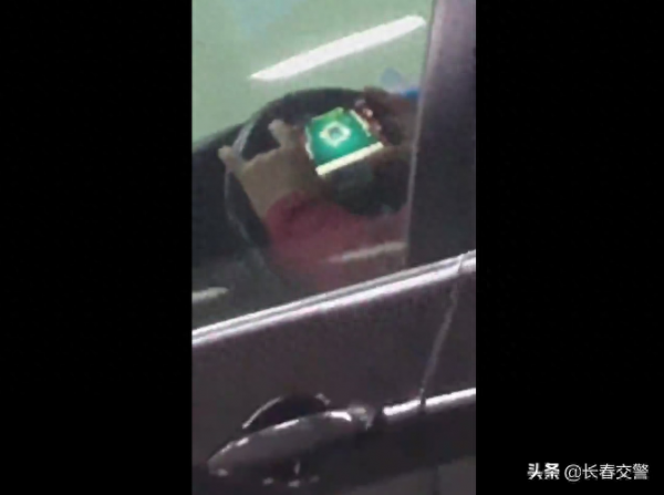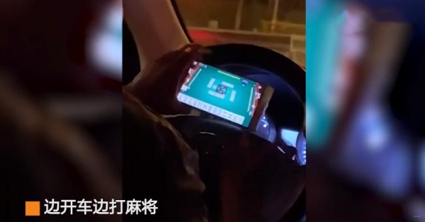 只见司机将手机放在方向盘的空挡处,手机画面显示为某麻将游戏界面,双手不时地操作着。