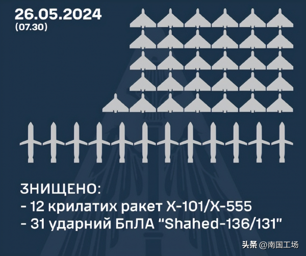 按照乌克兰空军的说法,俄军的米格-31K坦波夫地区上空发射3枚"匕首"高超音速导弹,图-95MS战略轰炸机从萨拉托夫地区上空发射15枚Kh-101/Kh-555巡航导弹,从阿赫塔尔斯克和克里米亚地区发射了31架沙赫德-136自杀式无人机。其中乌军成功拦截了12枚Kh-101/Kh-555巡航导弹;31架沙赫德-136自杀式无人机。可惜拦截战果完全是编造,没有任何证据显示乌军进行成功的拦截。事实上,当天,俄军空袭了旧康斯坦丁诺夫、文尼察、日托米尔、基洛沃格勒和基辅等地,乌克兰境内这么多大爆炸,乌克兰人都视而不见。