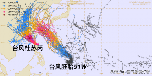 超级计算机的预报中认为,到7月28日前后,台风杜苏芮登陆并且开始深入我国时,菲律宾以东的台风胚胎91W将发展至中心气压跌破1000百帕,这意味着在台风杜苏芮后,台风卡努就要在7月底形成。