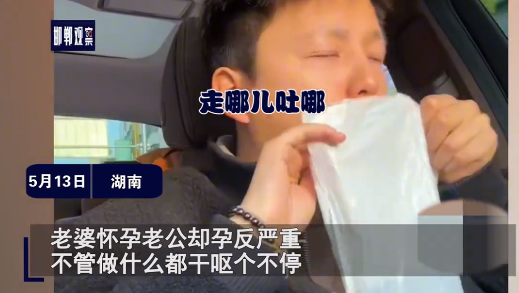 5月13日,湖南,老婆怀孕老公却孕反严重,不管做什么都干呕个不停,只要老婆开始有想吐的感觉,这种感觉就会转移到他身上,看到老公吐,老婆干呕的感觉立马消失了。