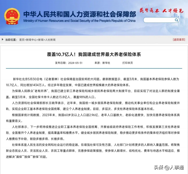 1.参保人数。截止3月末,我国养老保险参保人数已达10.7亿人,已建成世界规模最大的养老保险体系。