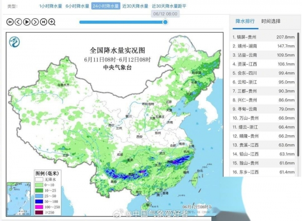 南方长江以南地区多地被大片阴云笼罩,出现大范围暴雨-大暴雨,雨带从云贵延伸到江西浙江,贵州锦屏24小时降雨207.8mm,云南湖南江西也有大暴雨,暴雨雨带绵长且雨量大,给当地带来了一定的灾害影响。