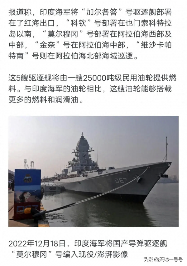 印度出动的这5艘驱逐舰是清一色的新锐防空驱逐舰,在规模上还超过了美国海军在红海的护航兵力。