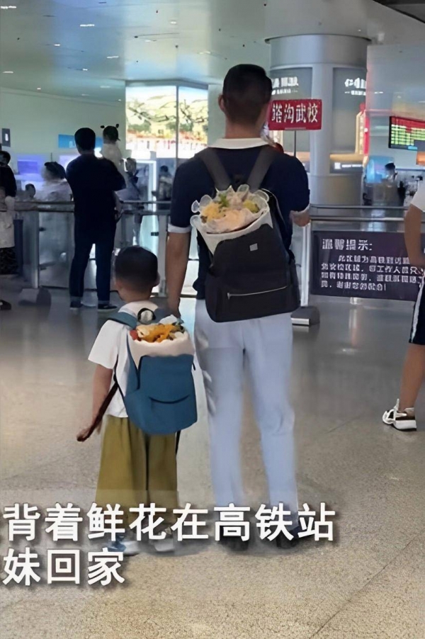 父子俩背着鲜花在车站迎接母女回家,扭转身给她们看花:太幸福了