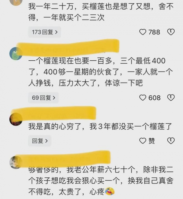 还有网友说,我老公一年二十多万,看着榴莲我还是绕道走。除非孩子想吃,偶尔买一次。不是买不起,而是觉得没有必要。