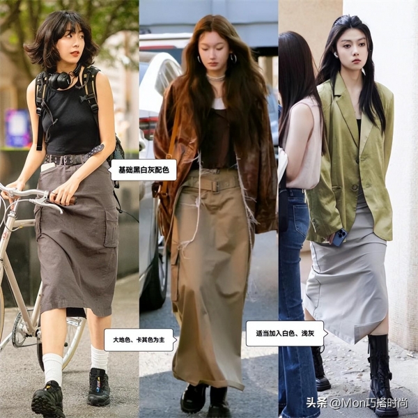可以选最基础的黑白灰,白色小面积使用作为提亮。以大地色或卡其色为主,则能轻松解锁末日废土风。加入浅卡其、暖白色或浅灰色则能让运动裙与其他低亮度中高饱和的彩色相配~