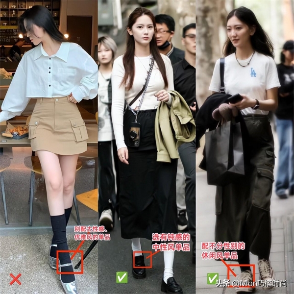 除此之外,也可选择深色系、宽鞋面、齿轮形厚底等带有一定钝感的鞋子平衡整体量感哟~