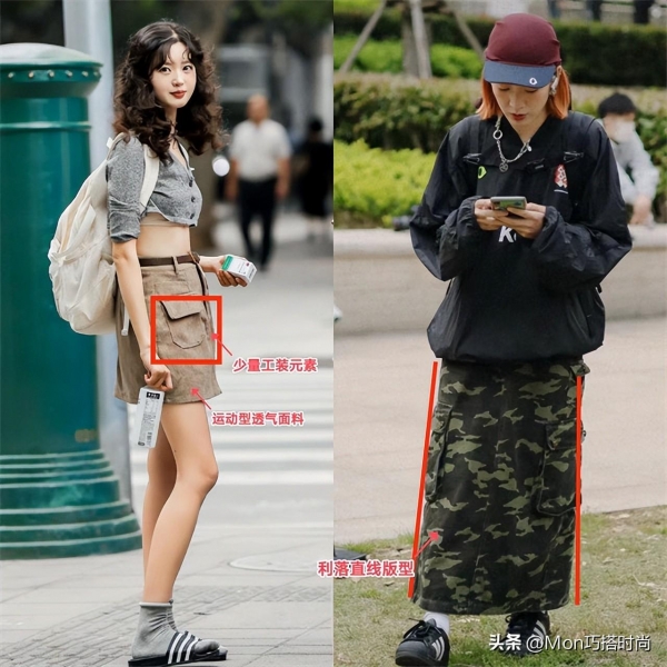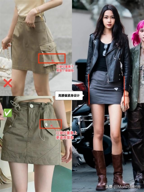 除了高腰设计以外,短款运动裙还有一个加分项:以口袋为代表的工装元素。这类元素要放在靠近腰部的位置才遮肉显高,位置太靠下反而会显腿短哦~