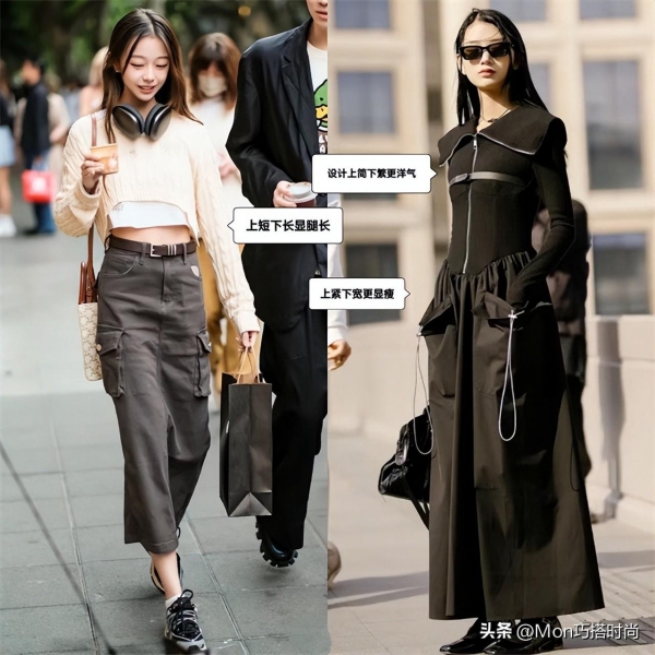 值得注意的是,短上衣尽量多选下摆修身的款式,宽下摆短上衣要叠穿才能避免臃肿。上衣的设计也千万别和裙身的工装元素撞了。