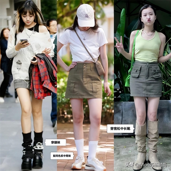 在上海时髦精眼里,短款运动裙还有一个"好搭档"--富有层次感和量感的鞋袜。宽松的腿袜、同色系中筒袜或宽松中长靴不仅能平衡重心,还能在一定程度上修饰小粗腿。