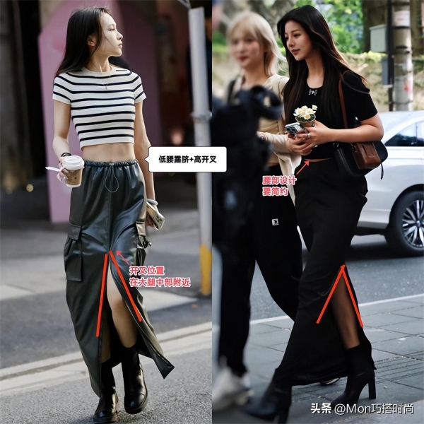 ①低腰露脐+高开叉穿法,低腰长裙也能有大长腿