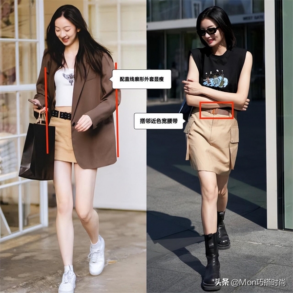 当然是靠廓形外套+宽腰带的双重配合。西装、牛仔夹克等直线轮廓、硬挺面料的廓形外套最适合上身偏壮的姐妹。邻近色宽腰带则能避免运动裙因太短而缺乏质感~
