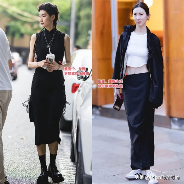 细腰姐妹就学左边选低腰露脐款,大胆穿短上衣,露出长腿妖娆性感;粗腰就上紧下宽穿裙,高开叉+高跟鞋塑造魔鬼身材。