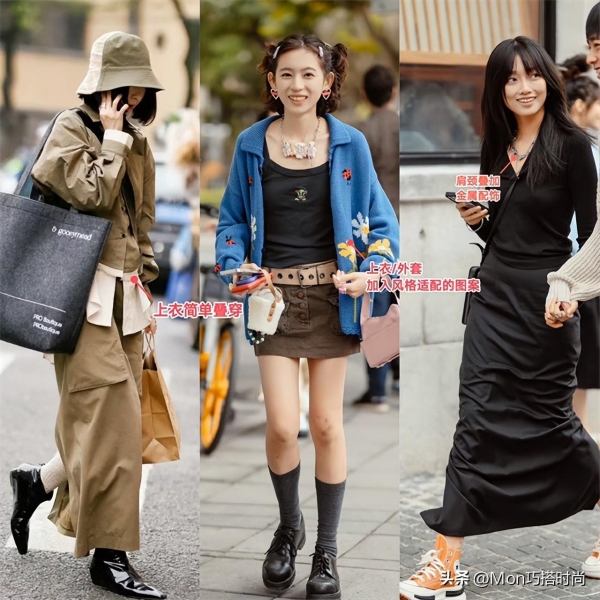全身基础色或选简约款时,就用上衣简单叠穿;配紧身上衣或短裙时,就搭宽松外套或加入图案或字母;上衣简约或有露肤时,就叠搭金属配饰。