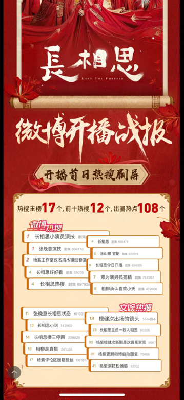 7月24日当晚,热搜排行榜前15名中,有五个话题冲进了榜单,分别是"张晚意演技""长相思男主是谁""长相思小演员演技 ""邓为演男狐狸精""涂山璟官配"。其中,"长相思小演员演技"这个话题一度喜提热搜第一,看来两位小演员以感染力极强的精湛演技逼哭网友。