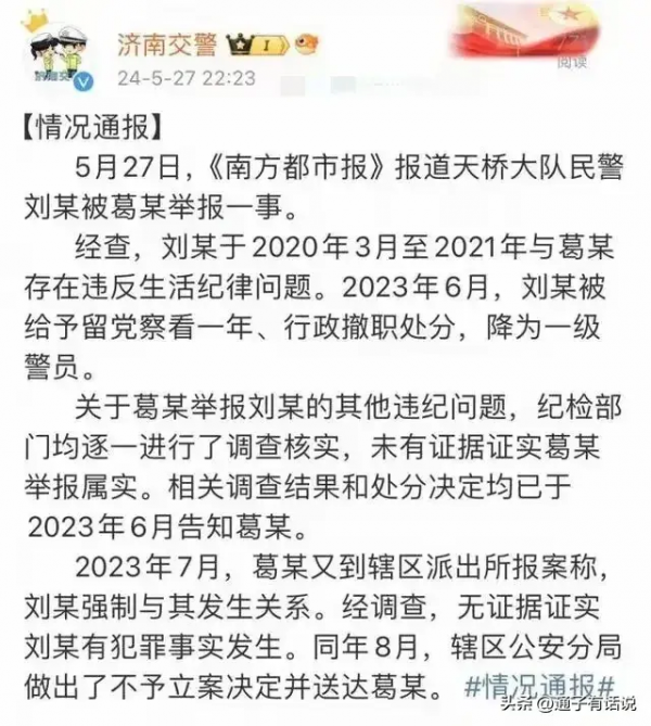 对于葛女士举报的视频内容,河南交警也是第一时间发出了通报,从通报内容来看,两人的确是存在恋爱关系,但是仅凭女方的一面之词,并没有实质性证据,最终也只是将刘某撤职处分,降为一级警员!