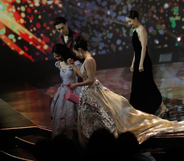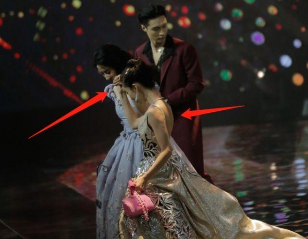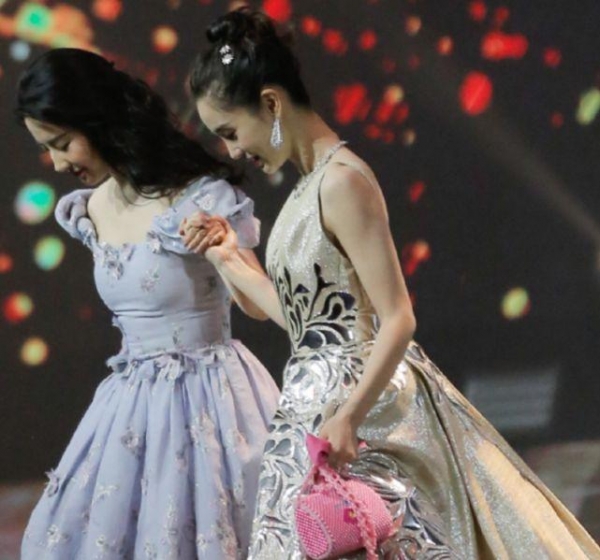 只不过在当晚,除了杨颖跟杨幂等人合照之外,其实杨颖还跟杨幂、刘亦菲以及佟丽娅等人一起在舞台上走秀。然而杨颖以及刘亦菲等人美则美矣,但裙子却着实碍地方,而且不便走路。那么在下台的时候,杨颖就扶着刘亦菲下台!