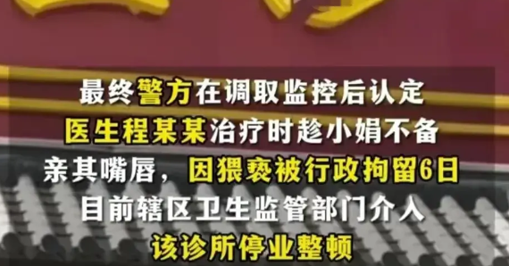 警方来后听双方各执一词,幸好这家诊所装有监控,遂调取监控后,警方认定:医生程某某治疗时趁女病人不备亲其嘴唇,强吻事实清楚,构成猥亵行为,给予行政拘留6日。目前辖区卫生监管部门已介入,该诊所停业整顿。