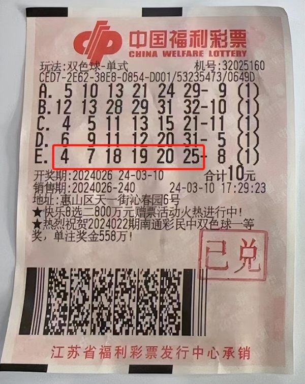 近日,无锡购彩者许先生来到该市福彩中心兑奖。他在福彩双色球第2024026期,凭借一张5注机选单式彩票,喜中1注二等奖5.9万多元。中奖彩票出自惠山区天一街沁春园6号32025160福彩销售站。
