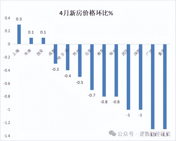 4月新房价格环比来看,重庆、广州、深圳、武汉的房价跌幅都在1%及以上,跌幅很惨。仅上海、天津、西安新房价格上涨,北京、杭州、南京也跌。
