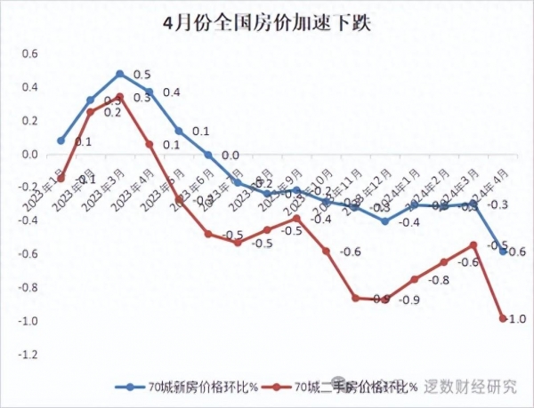根据国家统计局公布的70城房价数据,4月份全国新房价格和二手房价格的环比跌幅都扩大,新房4月环比大跌0.6%超过3月的0.3%的跌幅,二手房4月环比大跌1%,跌幅超过3月的0.5%。