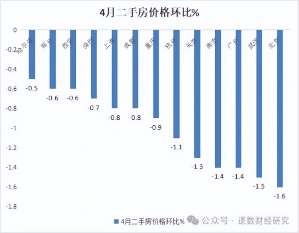 4月份北京二手房价大幅下跌1.6%,武汉跌1.5%,广州、南京跌1.4%,天津、杭州也跌超过1%。其他主要大城市的二手房价格都出现了惨烈的下跌。当前二手房价基本处于失控式的下跌状态,北京二手房跌幅最大。