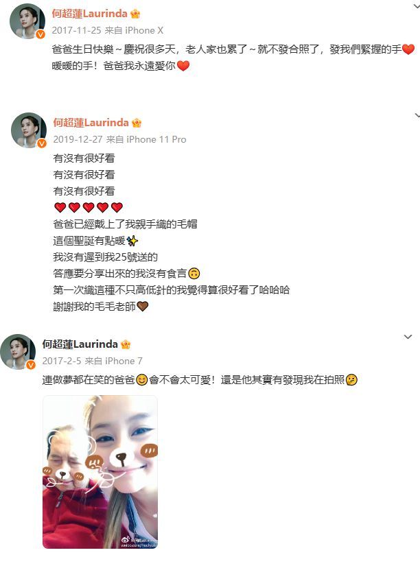 有如此父爱,何超莲自然非常满足,她时常在个人社交账号毫不避讳的表白父亲,任何人都看得出这对父女的挚爱深情。