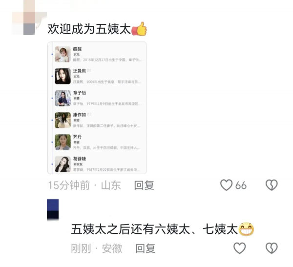 视频评论区全部都是讽刺的,说她是汪峰的第五个姨太,长久不了,后面还有六姨太七姨太。