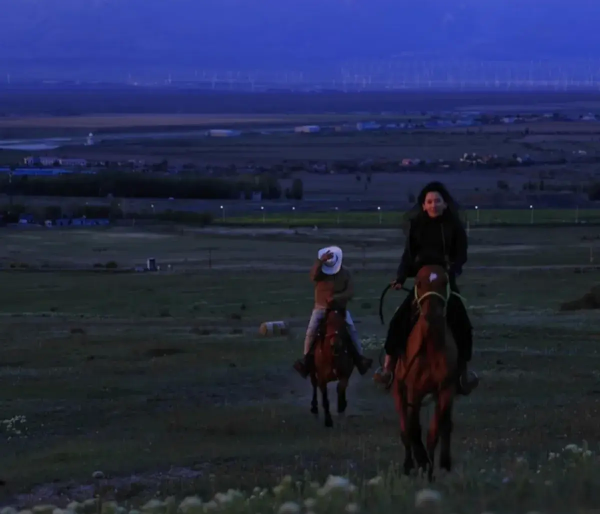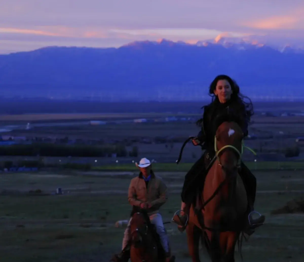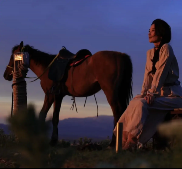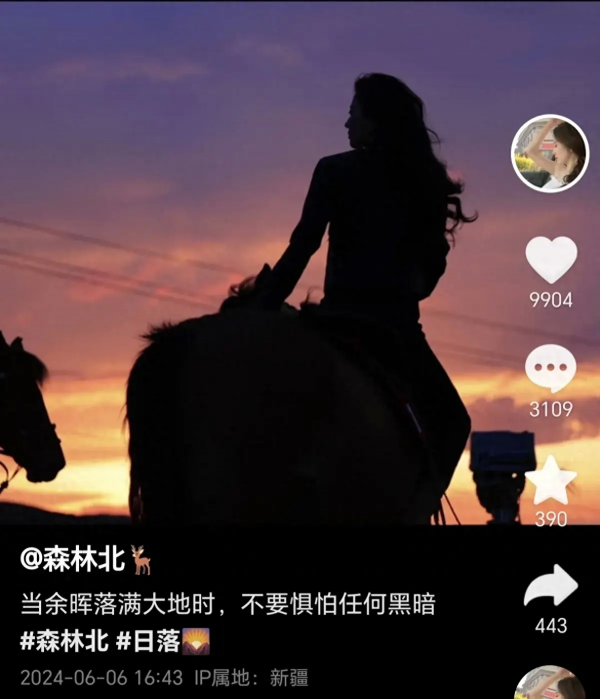 森林北拍的是落日下骑马的画面,配文案:当余晖落满大地时,不要惧怕任何黑暗。