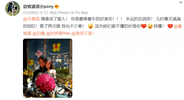 7月8日,有位女网友晒出与马景涛的亲密合影,疑似官宣了两人的结婚喜讯。称:"偶像成了爱人,你是最棒最牛的好演员,永远的吕洞宾,儿时夏天满满的回忆,离了两次婚我也不介意,因为她们都不懂得珍惜你。"