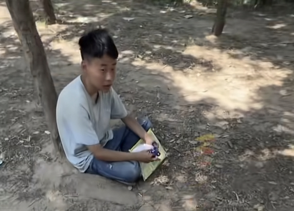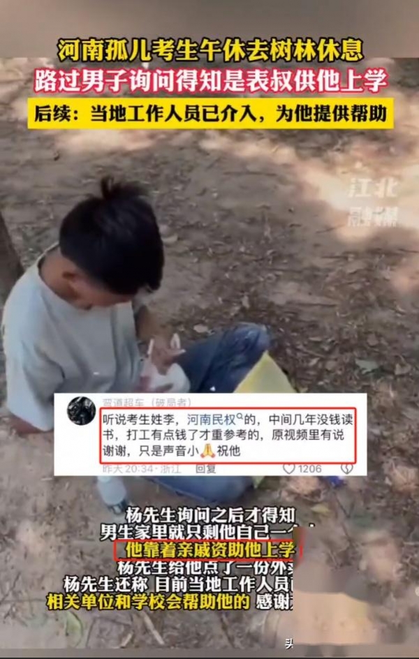 但是和这么温馨的场面形成鲜明对比的是,河南的李同学没有亲人的陪伴,也没有去吃饭,而是独自走向一片树林,在那里静静地等待下午的考试。一片凄凉的场景。