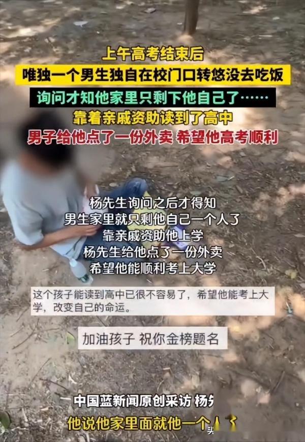 而这个场景正好被当天陪妹妹考试的杨先生看到,他很好奇,上去了解了情况后,才知道这位考生是一位孤儿,父母双亡,这几年读书都是他的一位表叔资助,以及自己零星在假期打工攒的钱。而表叔其实也不是很富裕,自己也辍学了一段时间,但是深知高考是唯一改变自己命运的机会,于是赚了点钱后又重返高考。之所以没吃饭是想着省点钱,等下午考完后再去吃。好心的杨先生,觉得这位考生太不容易了,为了让他吃饱饭能顺利参加考试,立马给这位考生点了一份外卖,怕他渴,又给他买了一瓶水。