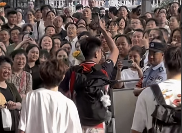 在高考第一天上午考完数学后,考生们纷纷走出考场,迎接他们的是父母家人的拥抱、加油打气,甚至还有鲜花。