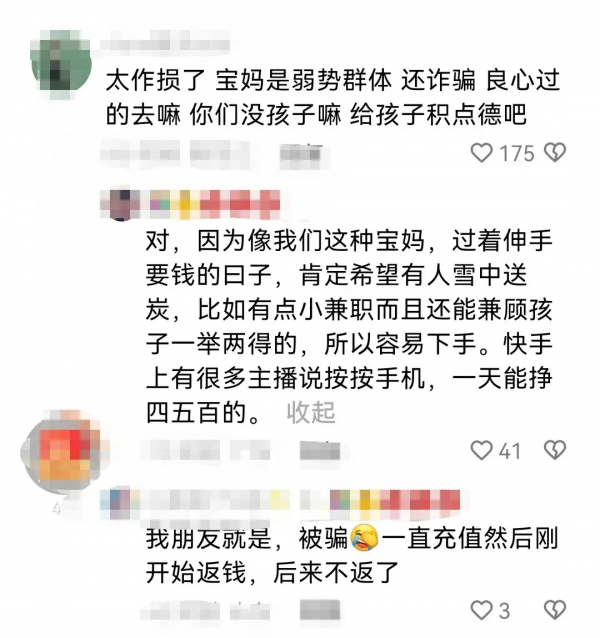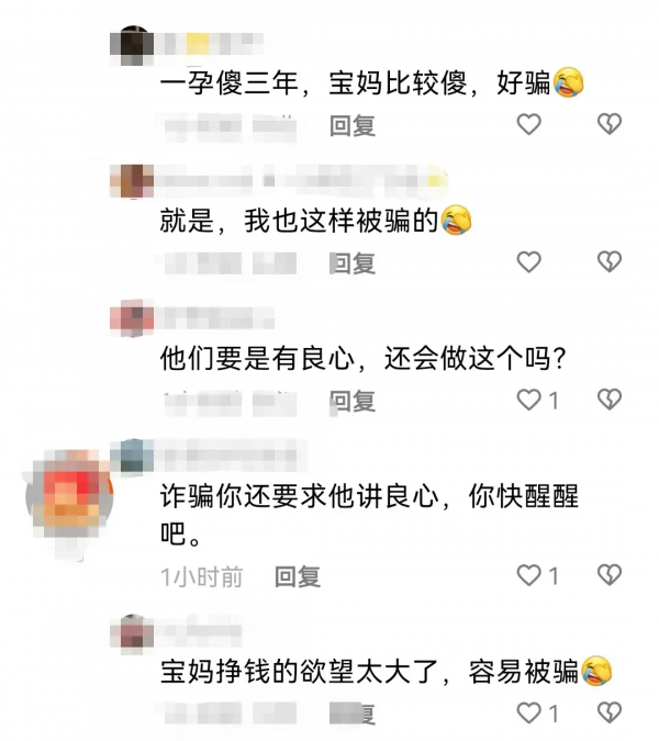 也有网友愤愤不平,太作损了,宝妈是弱势群体,还诈骗,良心过的去嘛,你们没孩子嘛,给孩子积点德吧。下面网友回复,一孕傻三年,宝妈比较好骗;宝妈挣钱欲望大,容易被骗;诈骗你还要求他讲良心,你醒醒吧。