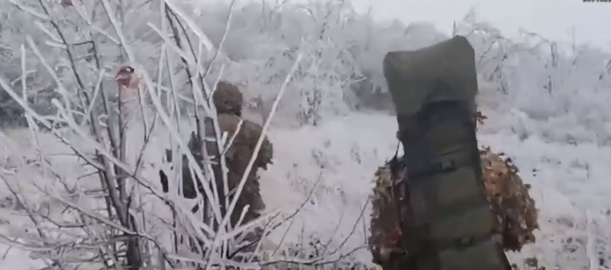 画面中,狙击手和观察员身穿吉利服,到达了射击点,并准备射击,南方部队的狙击手在战斗接触线附近作战,每天消灭小股试图攻击俄军阵地的乌军人员。