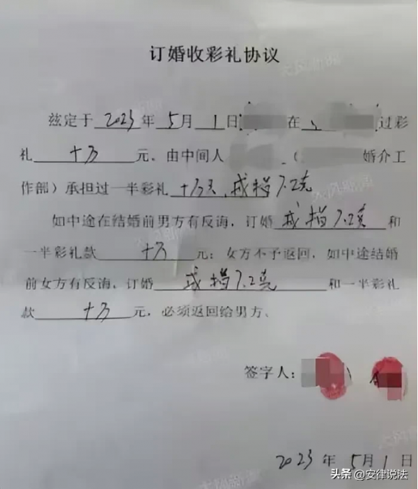 订婚当天,她的儿子给了女方10万元彩礼和1枚7.2克的金戒指,并承诺结婚时再给女方10万元,婚后1年后再在房产证上加上女方名字。女方不放心,还要求其儿子出具了一份承诺书。