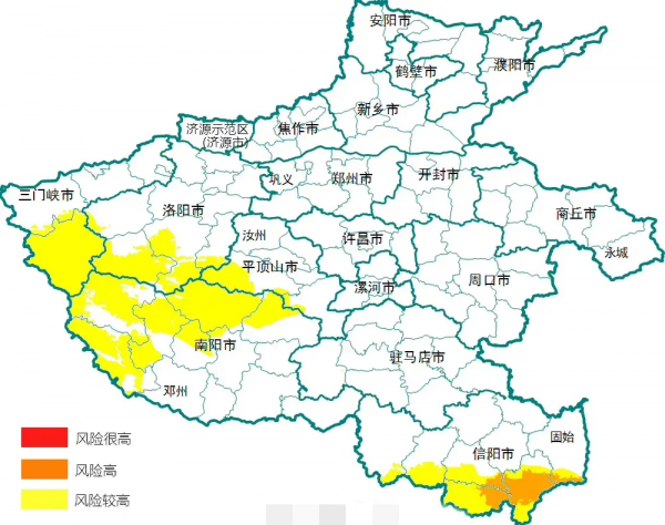洛阳、平顶山西南部,三门峡、信阳南部,南阳西部及北部地质灾害气象风险预警达到黄色预警,发生地质灾害的可能性较大其中信阳南部局地地质灾害气象风险预警达到橙色预警,发生地质灾害的可能性大