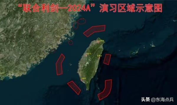 从随后公布的"联合利剑-2024A"演习区域示意图来看,和2022年佩洛西访台那次围岛演习区域对比,多了对澎湖外海海域,以及台湾控制的大陆周边岛屿,比如金门、妈祖、乌丘屿、东引岛水域的封锁,可以说套在台独分子上的枷锁又收紧了一分,困台更加密不透风。
