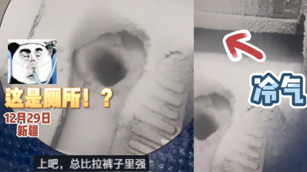 12月28日,男子乘坐新疆阿勒泰开往乌鲁木齐的K9736次列车去旅游,途中发现火车上厕所坑位周围结冰霜,冷水嗖嗖往外冒!